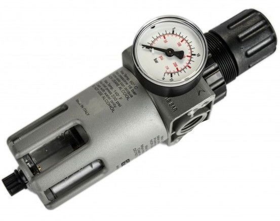 A sűrített levegős hálózatba építhető 1/2" szűrő-szabályzó, vízleválasztó egység centrifugál elvű szinterszűrővel van ellátva. A vízleeresztés kézi működtetésű.