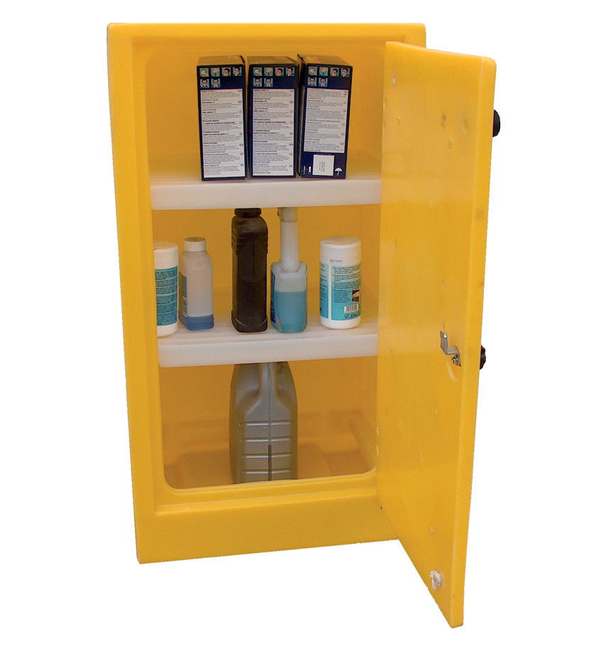• Zárható műanyag tárolószekrény polcokkal.